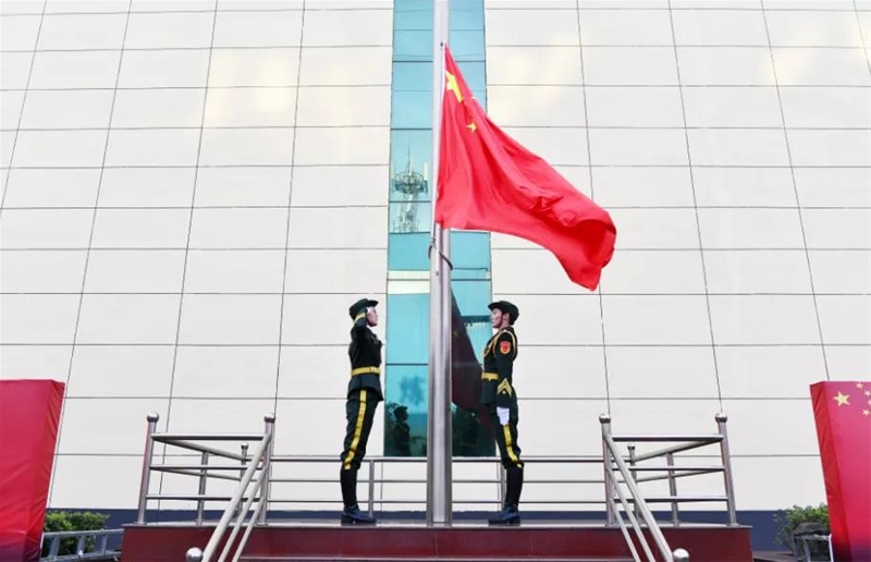 7:30分,英姿颯爽的國旗護(hù)衛(wèi)隊隊員邁著矯健的步伐,護(hù)衛(wèi)著五星紅旗走向升旗臺,在莊嚴(yán)雄壯的國歌聲中,鮮艷的五星紅旗在金色晨光的沐浴下,在眾人的注目下,冉冉升起,全場人員心情澎湃、豪情滿懷。共同祝愿偉大祖國繁榮昌盛、國泰民安,祝愿企業(yè)基業(yè)長青、蓬勃發(fā)展。