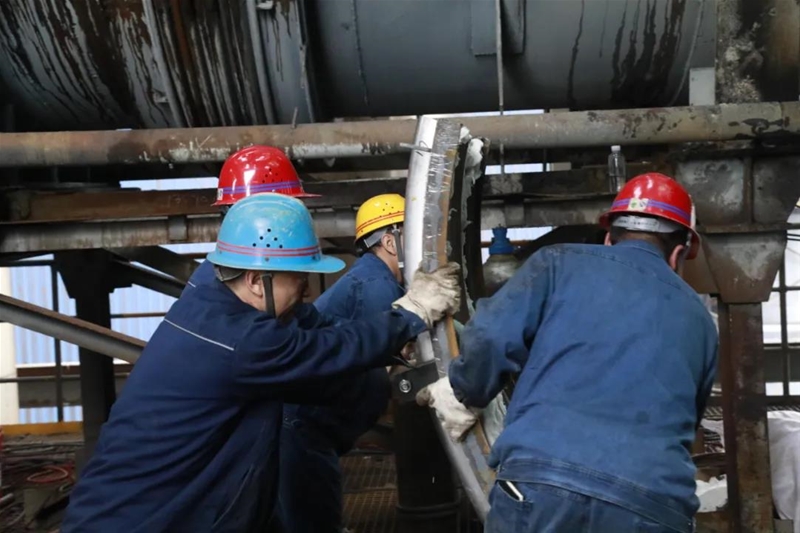 “來,再來兩個(gè)人,抬一下膨脹節(jié)……”有人艱難地拉動(dòng)備件,有人趕來幫忙,嘴里還喊著人員支援。話音未落,不遠(yuǎn)處外協(xié)工隊(duì)的工人們都跑了過來,齊心協(xié)力把膨脹節(jié)搬抬至指定位置。“小劉,廢舊的保溫磚一定要清理干凈!”“王師,管道焊接一定要高質(zhì)量!”“收到,一定保障新保溫磚鋪好……”