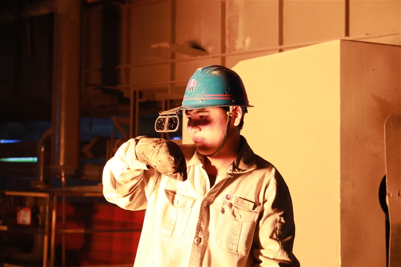 8點(diǎn)30分,6#轉(zhuǎn)爐操作室內(nèi),姚永青正全神貫注地扳動(dòng)操縱桿,室外的轉(zhuǎn)爐緩緩轉(zhuǎn)動(dòng)。頓時(shí),一股灼人的熱浪逼來(lái),轉(zhuǎn)爐張開(kāi)“火”盆大口,內(nèi)壁像巖漿表面隨時(shí)能?chē)姵龌饋?lái)。刺眼的紅光逼得人睜不開(kāi)眼睛,姚永青卻專(zhuān)注地盯著火紅的爐膛,認(rèn)真地觀察爐況。一眨眼的功夫,姚永青已經(jīng)沖到了爐前。再回來(lái)時(shí),他的汗正順著頭發(fā)往下滴,衣服已經(jīng)被汗水浸透。據(jù)了解,這樣的工作,他每天要重復(fù)十幾次。