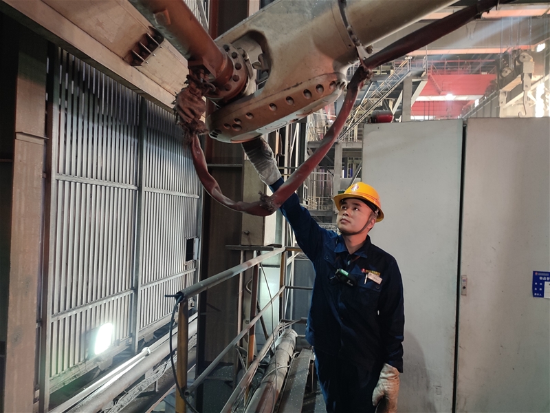“閔師傅,把軸流風(fēng)機(jī)底座固定結(jié)實(shí),方向調(diào)整合適,不要讓熱浪襲人,這樣員工作業(yè)才會(huì)有安全保證。”原料作業(yè)區(qū)混鐵爐安全員楊延生強(qiáng)調(diào)道。