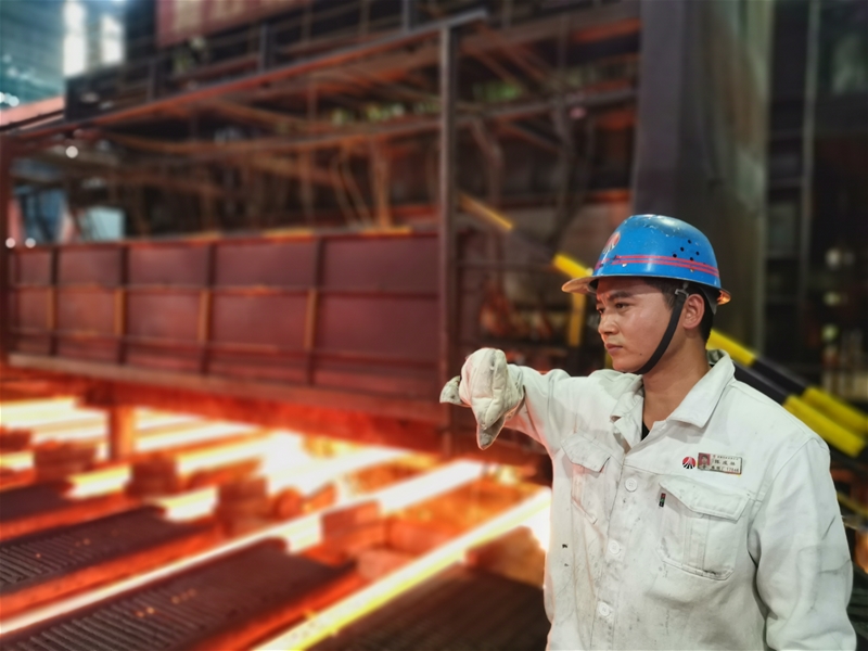 “注意五流,注意五流……”對講機(jī)里傳來推鋼工的聲音。拉矯剪切工小王迅速戴上厚厚的手套,一把抓起割槍,一旁的小張拉起氣帶緊跟其后,他們邁開步子,跨過前面幾流紅坯。小王點(diǎn)燃割槍,對準(zhǔn)連角位置,“滋……”一陣火光后,鋼坯順利前行,僅僅一分鐘不到,他們的臉已經(jīng)被烤得發(fā)紅,汗水在臉上集結(jié)成珠。他們每天堅(jiān)守在輥道旁,堅(jiān)持切、割、換、觀“四到位”。除了要觀察紅鋼坯的外觀質(zhì)量情況,掌握各流紅坯的去向,還要根據(jù)軋線與生產(chǎn)需求改換定尺規(guī)格、檢查割槍、氣帶接頭等等。
