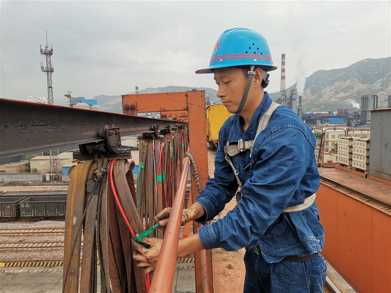 新站龍門吊鋼絲繩彎曲變形,必須停車檢修。時間緊,任務重,班組長段曉虎迅速制定好維修方案,安全員老劉布置好各項安全措施,一場檢修戰(zhàn)斗正式開始。摸著滾燙的扶梯,維修人員劉聰、孫宇一步一個臺階爬到龍門吊頂端,一股熱浪迎面襲來,進入小車減速機里面,里面散發(fā)著一股濃濃的油籽的味道。“人心齊,泰山移。”上面的兩位維修人員,與地上的三位工友齊聲喊著“一二、一二……”來來回回在滾筒與吊鉤之間穿插,汗珠流到臉頰時,他們就用胳膊肘擦一擦,抹得全臉都是淡淡的油污,豆粒般的汗珠沿著背夾往外流,衣服早已濕透。這樣的環(huán)境下他們毫不退縮,對鋼絲繩滾筒固定螺栓分別拆卸,一根全長100多米的鋼絲繩,在他們的配合下,僅用半小時就順利完成了,筆者不由為他們點贊。
