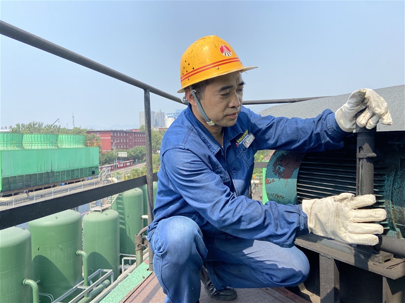 圖四:高達(dá)15米的冷卻塔塔頂,安全員楊利民正在對(duì)冷卻塔減速機(jī)油位進(jìn)行檢查,他用專注與敬業(yè)護(hù)航著設(shè)備順行,守護(hù)著員工安全。