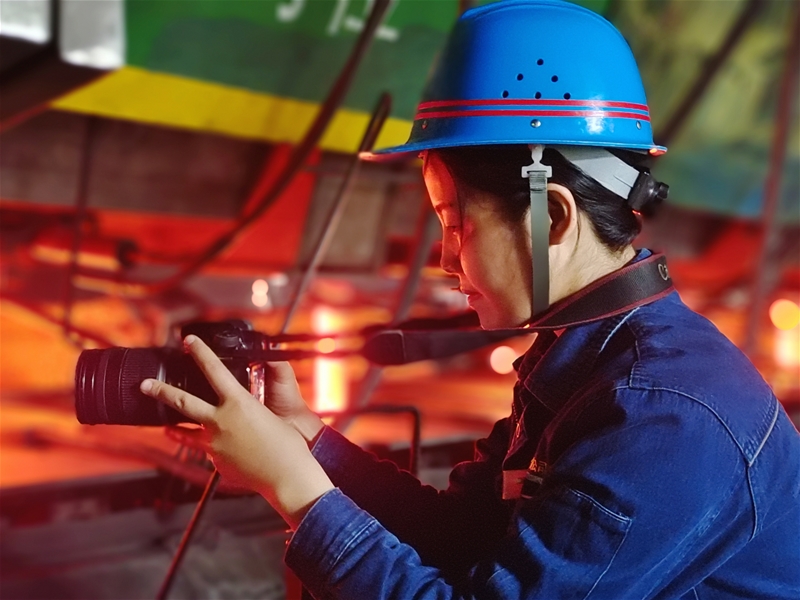 初見她時(shí),她戴著藍(lán)色安全帽,手里舉著照相機(jī),正在煉鋼廠6#連鑄機(jī)中包澆鋼區(qū)拍攝視頻。當(dāng)時(shí)正值夏季,室外溫度30度,火辣辣的太陽(yáng)炙烤著大地,仿佛要把所有東西都融化,廠房里的溫度更是高達(dá)四五十度,仿佛一個(gè)巨大的“蒸籠”。她半蹲在鋼流前,任憑身后鼓鼓的風(fēng)機(jī)肆意地吹向她,藍(lán)色工作服在強(qiáng)力的風(fēng)中緊緊地貼著她的身體,鬢角散落的發(fā)絲在風(fēng)中隨意飄蕩,但她依然堅(jiān)守在鋼流前,用手中的相機(jī)記錄現(xiàn)場(chǎng)設(shè)備改造這一場(chǎng)景,成為連鑄平臺(tái)上一道靚麗的風(fēng)景線。