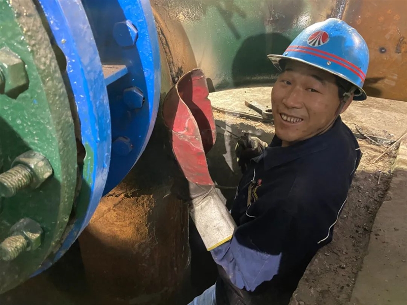 在高線循環(huán)泵房內(nèi),只見進(jìn)水主管道一角弧光閃耀、焊花飛濺,卻不見人影,走近一看,原來焊工梁曉鋒正蜷縮在管道的縫隙中進(jìn)行管道焊接作業(yè)。看似簡單的焊接作業(yè),實(shí)則不易,由于空間狹小,身高一米八的他在縱橫交錯的管道中不斷變換著姿勢,時而仰面、時而下蹲、時而平躺,起弧、運(yùn)條、點(diǎn)焊、收尾……焊把在他的手中飛舞,美麗的弧光映紅了他的臉龐。面對一道道完美的焊縫,他臉上露出了滿意的笑容。他抖了抖麻木的腿腳,直了直酸痛的腰背,然后又投入到另一項縫隙焊接工作中……