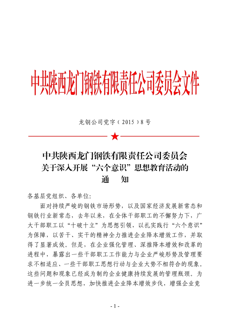 中共陜西龍門鋼鐵有限責任公司委員會 關于深入開展“六個意識”思想教育活動的通知