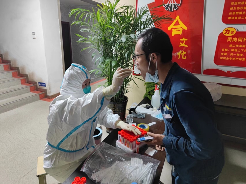 “請大家按順序排好隊,互相保持一米距離,戴好口罩、出示一碼通個人電子碼,先掃碼后做核酸……”8月21日下午5點,公司第二輪全員核酸檢測全面展開。